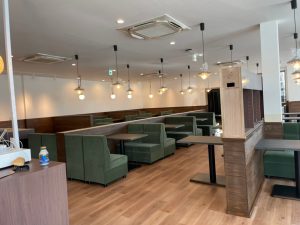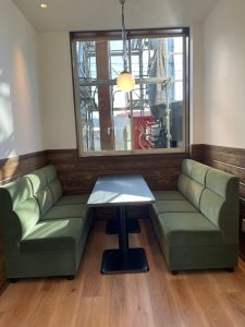 シンプルな内装にモケット生地のソファを入れる事で雰囲気が変わりました