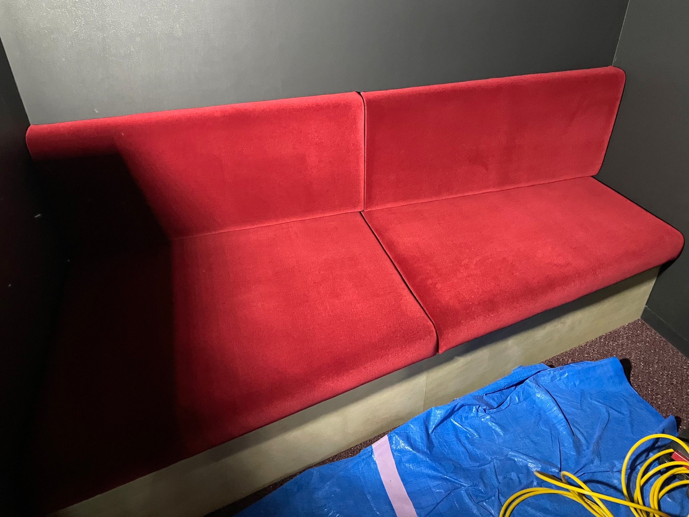 個室空間にコの字型に設置された赤いベンチ