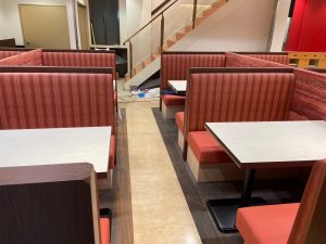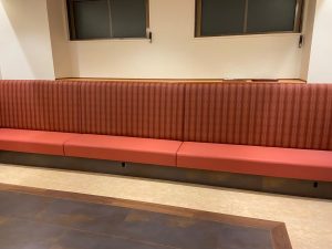 背中はストライプの柄で、縫う際に柄を合わせるように裁断を工夫しています